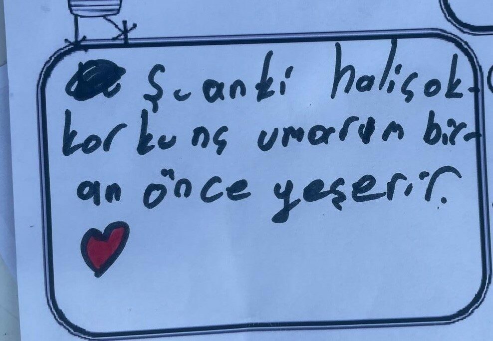 Bazı çocuklar ise boyama kağıtları üzerine, “Şu anki hali çok korkunç. Umarım bir an önce yeşerir.”, “Ormanın değerini bilemediğimiz için yanıp gül oldu”, “Hemen ağaçlandırılmalı, yeşillendirilmeli” gibi yazılarla duygularını dile getirdi.