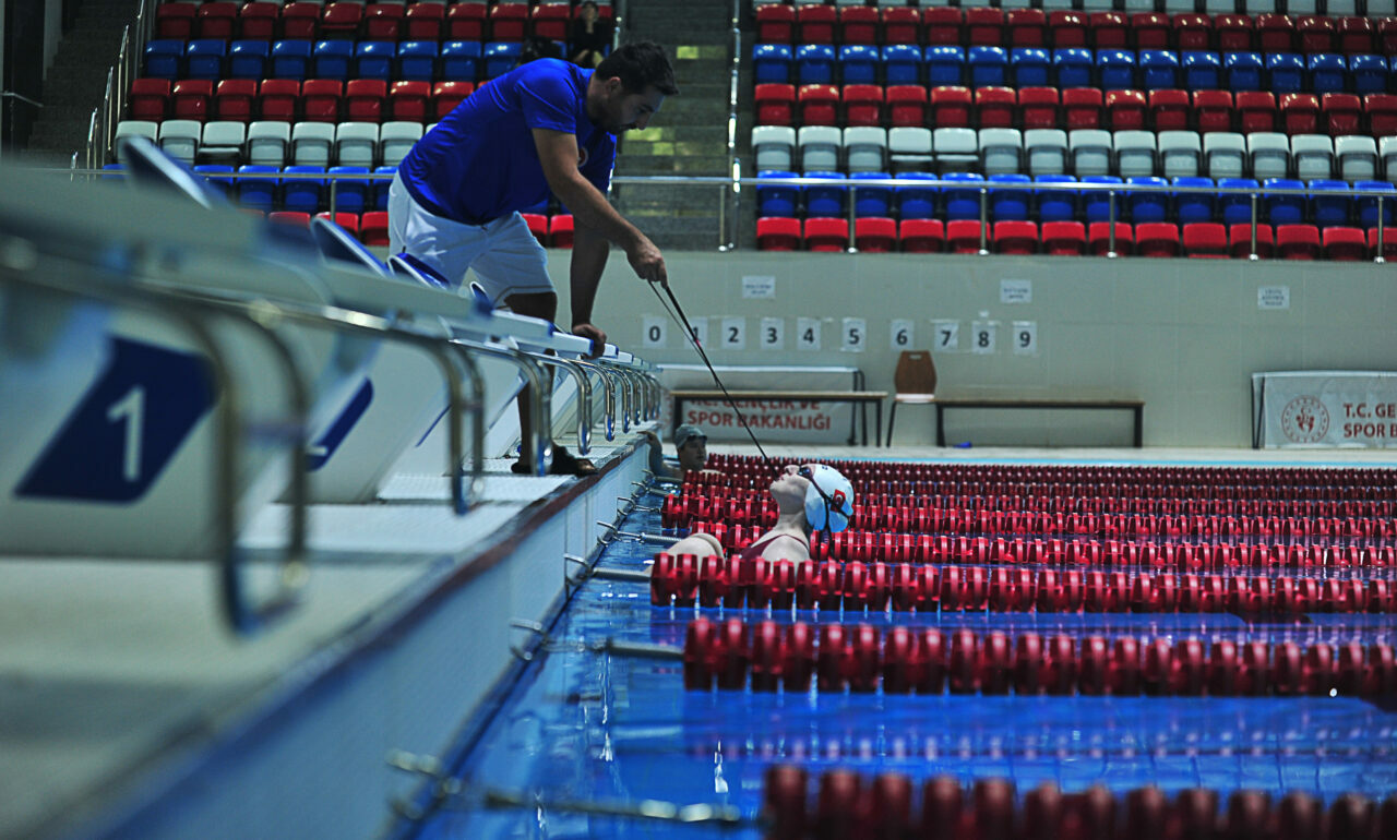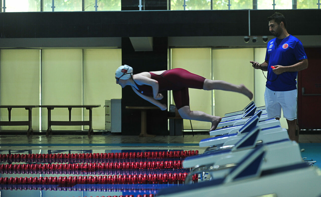 Havuza tedavi amacıyla gelen Esra’nın yeteneğiyle öne çıktığını ve amaçlarının katıldıkları yarışmalarda İstiklal Marşını okutmak olduğunu söyleyen yüzme antrenörü İlyas Aziz, “Esra, İstanbul’da ev sahipliği yaptığımız Avrupa Gençlik Oyunlarında 50 metre kelebek ve sırtüstünde 1’inci oldu. 200 metre serbestte ise 2’nci oldu. Önümüzdeki yıl yarışmalar devam edecek, biz de çalışmalarımıza devam edeceğiz. Hedefimiz yarışmalarda madalya alıp, İstiklal Marşımızı okutmak. Paralimpik yüzücülerde bazı ekipmanlara müsaade ediliyor. Esra, yüzerken kollarını kullanamadığı için, ‘start’ için dişleriyle ısırdığı bir aparatı terzi de diktirdik” diye konuştu.