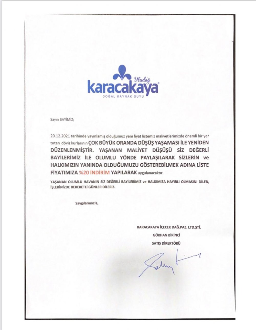 Firmanın sahibi Sinan Kahraman, kurdaki düşüşü referans alarak Karacakaya markasına ait su fiyatlarında yüzde 20’lik indirime gitti.