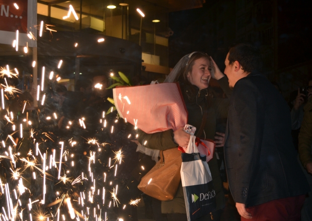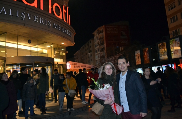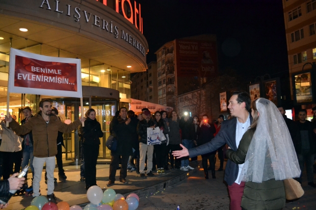 Bursa’da ikamet eden Semih Dönmez (23), Eskişehir’de üniversite yıllarında arkadaşları vasıtasıyla tanıştığı Özge Yıldırım için (23) farklı bir evlenme teklifi gerçekleştirdi. Dönmez, kız arkadaşı Yıldırım’a Bursa’da olduğunu ve iş başı yaptığını belirtip, 13 arkadaşıyla toplanarak, yapacağı evlenme teklifi için Eskişehir’de bir arkadaşının evine kapanıp hazırlıklara başladı. El birliğiyle balon ve afiş hazırlayan gençler, akşam saatlerinde İsmet İnönü Caddesi üzerinde bulunan bir alışveriş merkezinin önüne geldi.