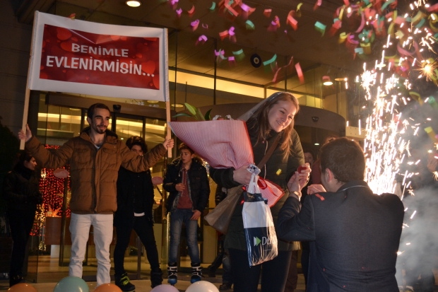 Semih Dönmez, kuzenine de kız arkadaşı Özge Yıldırım’ı aratarak, İngilizce konusunda yetersiz olduğunu, özel ders istediğini ve bulundukları alışveriş merkezinin önüne buluşup, Yıldırım ile vereceği özel ders hakkında konuşmak istediğini söyletti. Dönmez, yaptıkları organizasyonu AVM önüne hazırlayarak, bir başka çiftin evlenme teklifi hazırlığı gibi gösterip, sahte evlenme teklifi ortamı oluşturdu. Arkadaşları ise, cadde üzerinden geçen insanlardan rica ederek, yapılacak teklif konusunda kendilerine yardımcı olmalarını istedi.