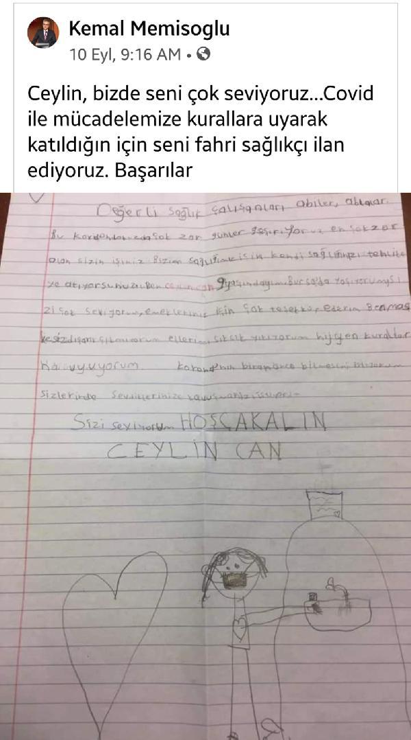 İlkokul 3’üncü sınıf öğrencisi Ceylin Can, koronavirüsle mücadele eden sağlık çalışanlarına sevgisini kaleme aldığı mektupla dile getirdi. Küçük kız mektubunda, “Değerli sağlık çalışanı ablalar, ağabeyler.. Bu koronovirüs ile çok zor günler geçiriyoruz. En çok zor olan sizin işiniz. Bizim sağlığımız için kendi sağlığınızı tehlikeye atıyorsunuz. Ben Ceylin Can, 9 yaşındayım ve Bursa’da yaşıyorum. Sizi çok seviyorum. Emekleriniz için çok teşekkür ediyorum. Ben maskesiz dışarı çıkmıyorum. Ellerimi sık sık yıkıyorum. Hijyen kurallarına uyuyorum. Koronavirüsün bir an önce bitmesini ve sizlerin de sevdiklerinize kavuşmanızı istiyorum. Sizi seviyorum. Hoşça kalın” dedi. Ceylin’in anne-babası da kızlarının mektubunu, İstanbul İl Sağlık Müdürklüğü’ne gönderdi. İstanbul İl Sağlık Müdürü Kemal Memişoğlu, mektubu sosyal medya hesabından paylaştı.