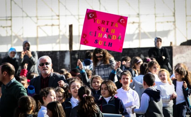 Okul yönetimince yeni yıl öncesi hazırlanan etkinlikte öğrenciler, dileklerini sesli paylaştıktan sonra öğretmenleri tarafından kendilerine verilen güvercinleri gökyüzüne bıraktı. Öğrencilerin elindeki, “Kadınlar, anneler şiddet görmesin, ölmesin”, “Savaş yüreklilik değil, korkaklıktır” ve “Yurtta sulh cihanda sulh” yazılı dövizler dikkati çekti.
