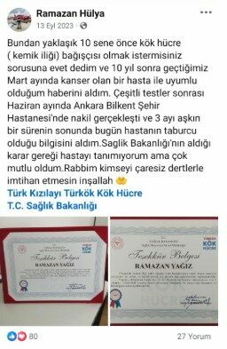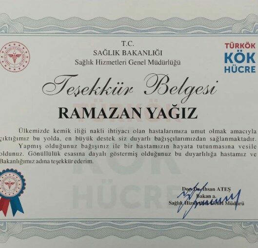Öte yandan şehit Hava Uçak Bakım Astsubay Başçavuş Ramazan Yağız’ın, 10 yıl önce kök hücre bağışında bulunduğu, 2023 Haziran ayında Ankara Bilkent Şehir Hastanesi’nde tedavi gören kanser hastasıyla uyumlu olması sonucu ise naklin gerçekleştiği öğrenildi. Şehit Yağız, Sağlık Bakanlığı tarafından gönderilen Teşekkür Belgesi’ni ve mutluluğunu, “Bundan yaklaşık 10 sene önce kök hücre (kemik iliği) bağışçısı olmak ister misiniz sorusuna evet dedim ve 10 yıl sonra geçtiğimiz Mart ayında kanser olan bir hasta ile uyumlu olduğum haberini aldım. Çeşitli testler sonrası Haziran ayında Ankara Bilkent Şehir Hastanesi’nde nakil gerçekleşti ve 3 ayı aşkın bir sürenin sonunda bugün hastanın taburcu olduğu bilgisini aldım. Sağlık Bakanlığı’nın aldığı karar gereği hastayı tanımıyorum ama çok mutlu oldum. Rabb’im kimseyi çaresiz dertlerle imtihan etmesin inşallah” mesajıyla sosyal medyadan paylaştığı ortaya çıktı. (DHA)