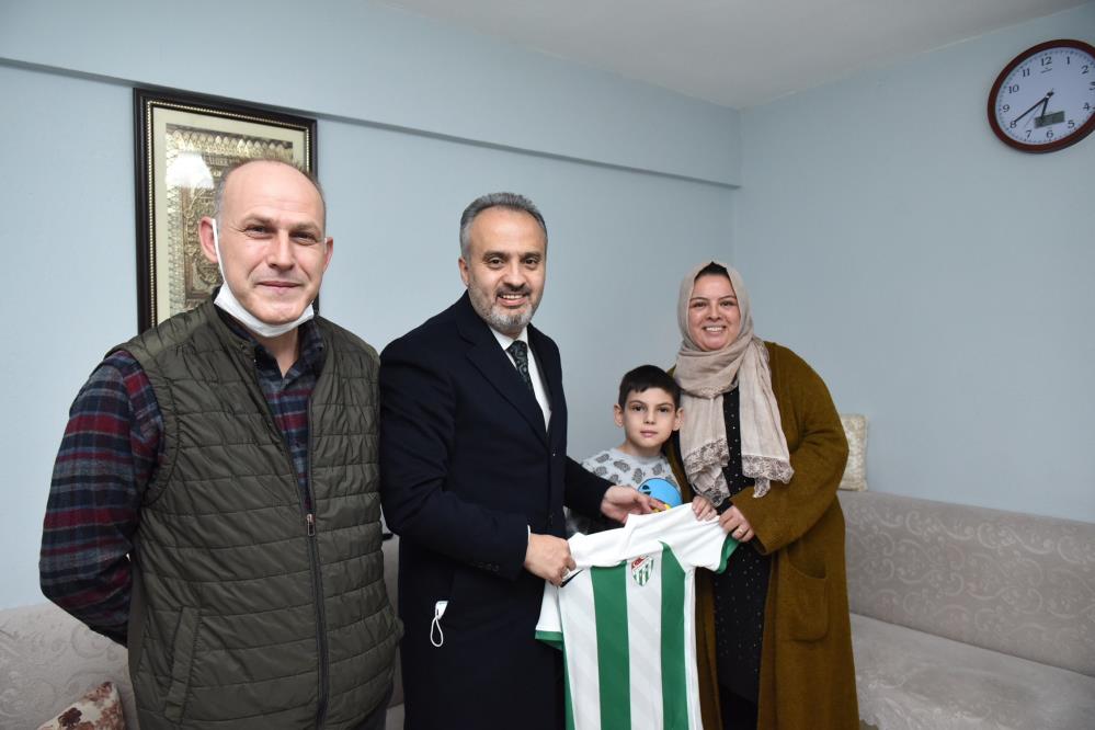 Esra-Özcan Erguvan çiftiyle sohbet eden Başkan Aktaş, ailenin 9 yaşındaki küçük çocukları Kağan’a da Bursaspor forması ve çeşitli hediyeler verdi. Yatağa bağımlı çocukları için mücadele eden Erguvan çiftini tebrik eden Başkan Aktaş, oğlunun başından bir an olsun ayrılamamasına rağmen sırf aile bütçesine katkı için mum yapıp satan anne Esra Erguvan’a teşekkür etti. Erguvan ailesine moral vermek için 100 adet jel mum sipariş eden Başkan Alinur Aktaş, “Annemizin Yusuf’la alakalı emeğinin yanında kendisinin de bir şeyler üretmesi, hediyelik mum ve benzer ürünler yapması, aile bütçesine katkıda bulunması hakikaten takdire şayan. Zaten üreten kadınlarımızı destekliyoruz. Kadın kooperatiflerimizi çok önemsiyoruz. Bunun yanında Esra hanımın gayretini takdir etmemek mümkün değil. Kutluyorum, tebrik ediyorum, yürekten alkışlıyorum. Ben de bu akşam mum siparişimi verdim. Herkes sevdiklerine bu mumları hediye edebilir diye düşünüyorum. Rabbim Yusuf yavrumuza şifalar versin” dedi.