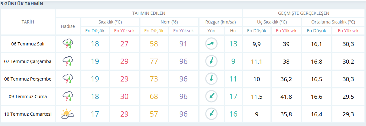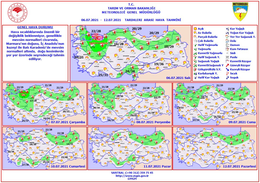 Haftalık Hava Durumu (6 – 12 Temmuz 2021) Hava sıcaklıklarında önemli bir değişiklik beklenmiyor, mevsim normalleri civarında, Marmara’nın doğusu, İç Anadolu’nun kuzeyi ile Batı Karadeniz’de mevsim normalleri altında, doğu kesimlerde yer yer üzerinde seyredeceği tahmin ediliyor.