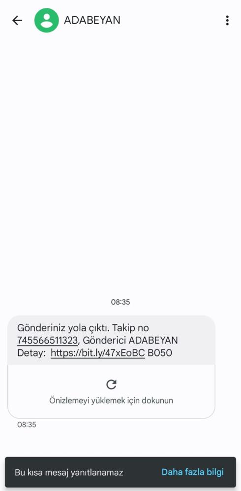 Milyonlarca cep telefonu kullanıcısına bu sabah saatlerinde bir alışveriş sitesinin de ismi ve uygulaması taklit edilerek “SMS ile gönderilen Adabeyan kargo gönderiniz yola çıktı, kargo takip ‘745566511323’ numarası” şeklindeki mesaj tedirginliğe yol açtı.