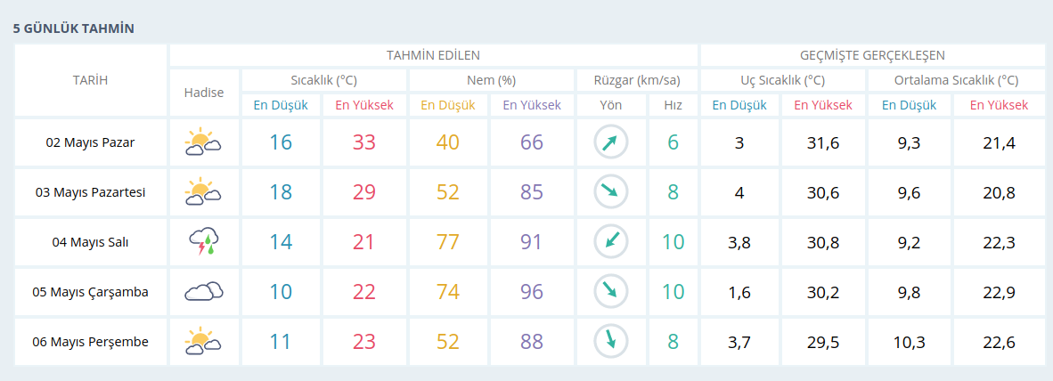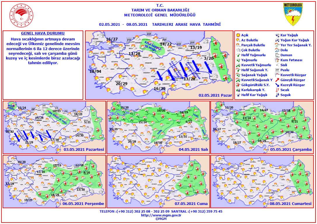 Haftalık Hava Durumu (2 – 8 Mayıs 2021) Hava sıcaklıklarının artmaya devam edeceği ve Ülkemiz genelinde mevsim normallerinin 6 ila 12 derece üzerinde seyredeceği, Salı ve Çarşamba günleri kuzey, iç ve batı kesimlerde biraz azalacağı tahmin ediliyor.