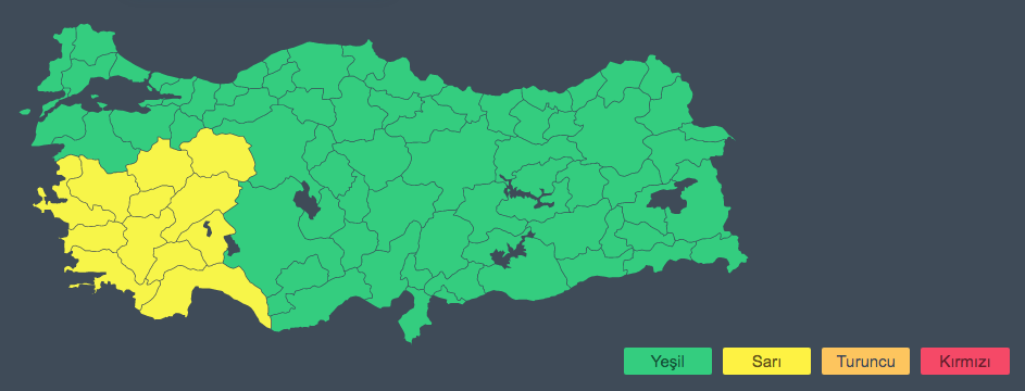 Yağışların; Ege Bölgesi (Kütahya, Afyonkarahisar, Uşak, Denizli, Manisa, İzmir’in kuzey ve doğu çevreleri, Aydın ve Muğla’nın iç kesimleri), Batı Akdeniz’in iç kesimleri (Burdur ve Isparta çevreleri ile Antalya’nın iç kesimleri) ile Eskişehir çevrelerinde yerel olmak üzere kuvvetli olması bekleniyor. Rüzgarın; Marmara ile Kuzey Ege kıyılarında kuzey ve kuzeydoğu yönlerden yer yer kuvvetli (40-60 km/saat) olarak eseceği tahmin ediliyor.