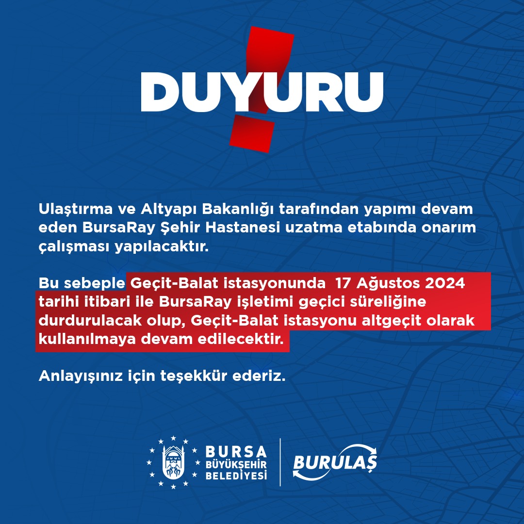 Bu sebeple Geçit – Balat İstasyonunda 17 Ağustos 2024 tarihi itibari ile BursaRay işletimi geçici süreliğine durdurulacak olup Geçit Balat istasyonu altgeçit olarak kullanılmaya devam edilecektir.”