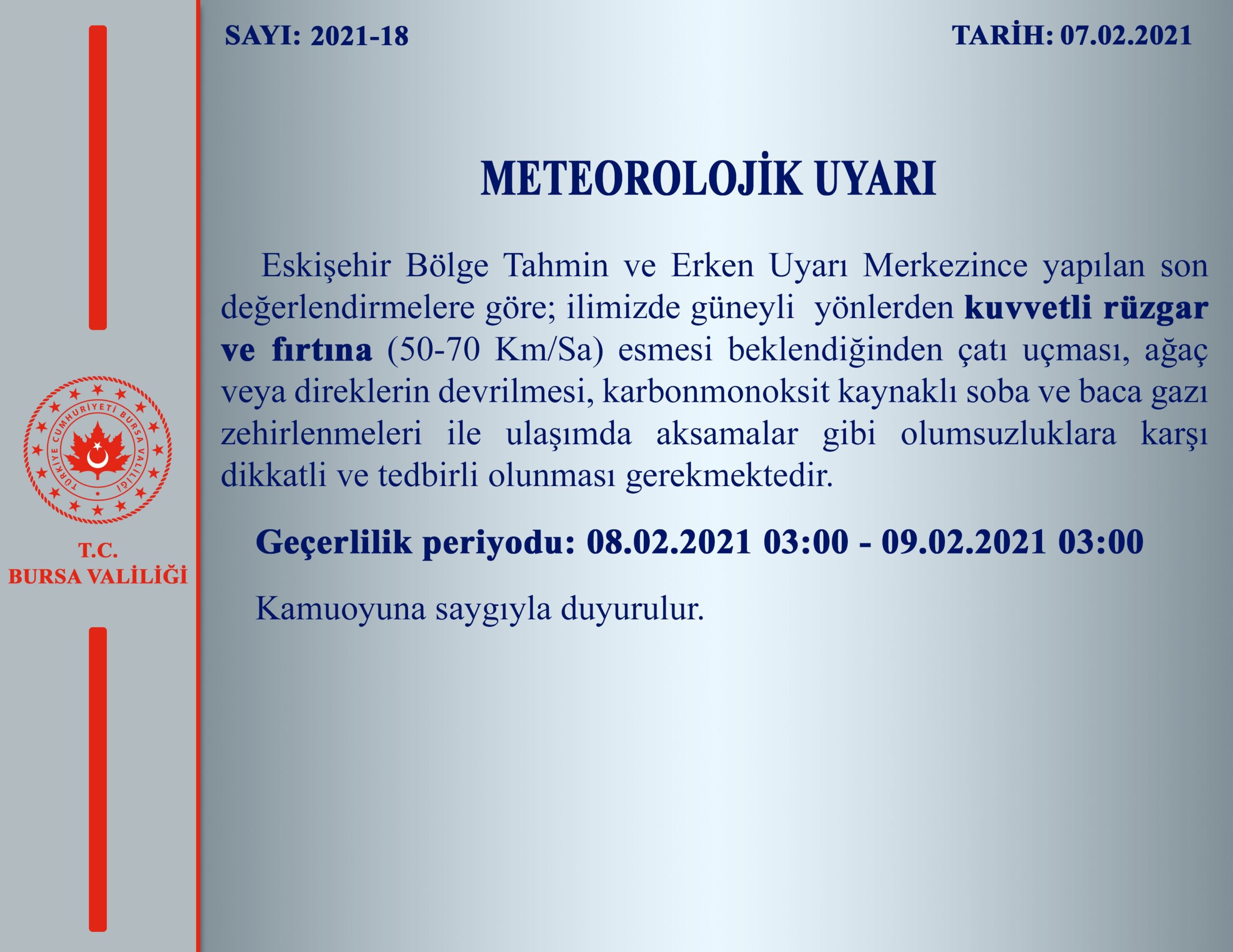 Ana Sayfa › Bursa › Merkez › Bursalılar dikkat! Bir uyarı da Valilikten…Bursalılar dikkat! Bir uyarı da Valilikten… Bursa Valiliği kuvvetli rüzgar ve fırtına konusunda sosyal medyadan vatandaşları uyardı. Giriş: 07-02-2021 15:27Kaynak: MerkezBursa ABONE OL + - Bursa Valiliği’nden yapılan açıklama şöyle; HABERİ PAYLAŞ
