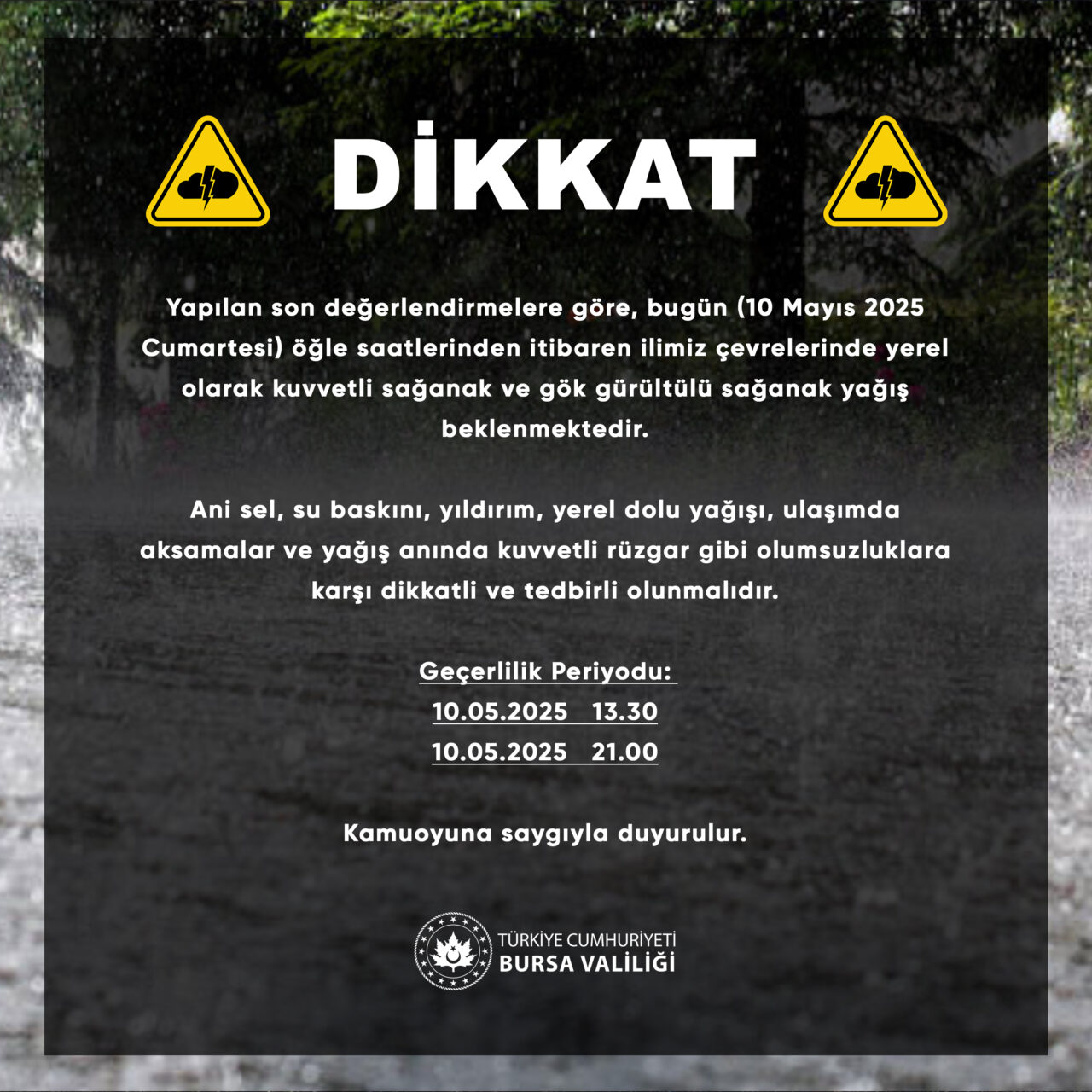 “Yapılan son değerlendirmelere göre, bugün (10 Mayıs 2025 Cumartesi) öğle saatlerinden itibaren ilimiz çevrelerinde yerel olarak kuvvetli sağanak ve gök gürültülü sağanak yağış beklenmektedir.
