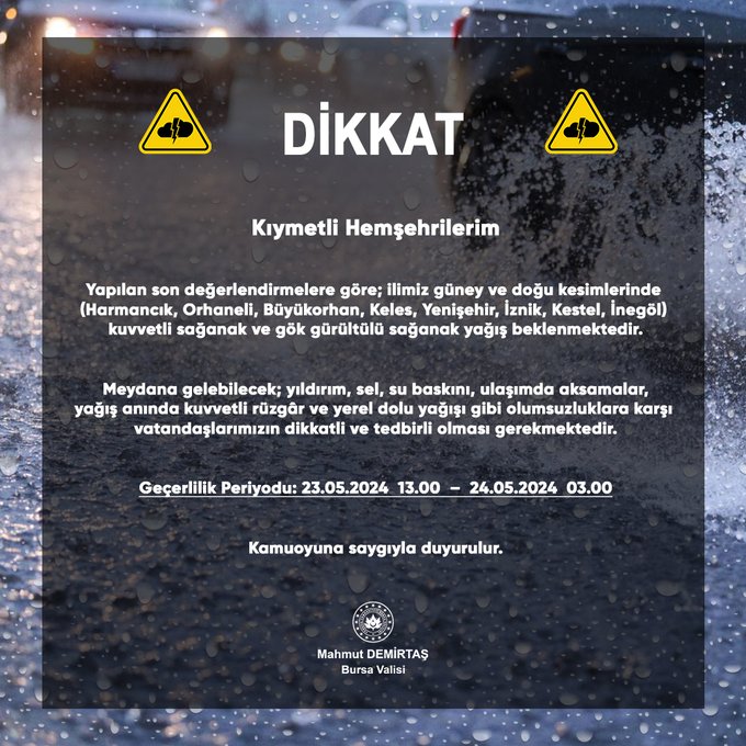 “Yapılan son değerlendirmelere göre; ilimiz güney ve doğu kesimlerinde (Harmancık, Orhaneli, Büyükorhan, Keles, Yenişehir, İznik, Kestel, İnegöl) kuvvetli sağanak ve gök gürültülü sağanak yağış beklenmektedir.