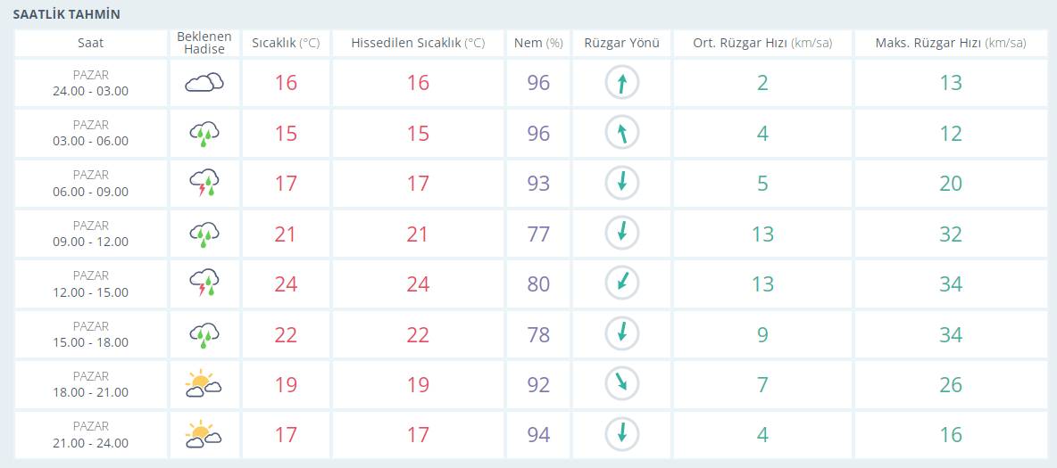 Parçalı ve çok bulutlu, bölge genelinin (Hakkari ve Şırnak hariç) yerel olmak üzere sağanak ve gök gürültülü sağanak yağışlı geçeceği tahmin ediliyor. Yağışların, Malatya çevrelerinde yer yer kuvvetli olması bekleniyor. Rüzgarın, doğu kesimlerinde güney yönlerden kuvvetli (40-60 km/saat) olarak eseceği tahmin ediliyor.