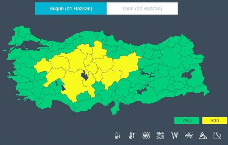 Afyonkarahisar, Ankara, Çankırı, Çorum, Eskişehir, Kayseri, Kırşehir, Konya, Kütahya, Nevşehir, Sivas, Yozgat, Aksaray ve Kırıkkale için sarı kodlu uyarı verildi.
