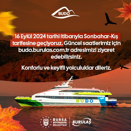 “16 Eylül 2024 tarihi itibarıyla sonbahar-kış tarifesine geçiyoruz. Güncel saatlerimiz için budo.burulas.com.tr adresimizi ziyaret edebilirsiniz.”