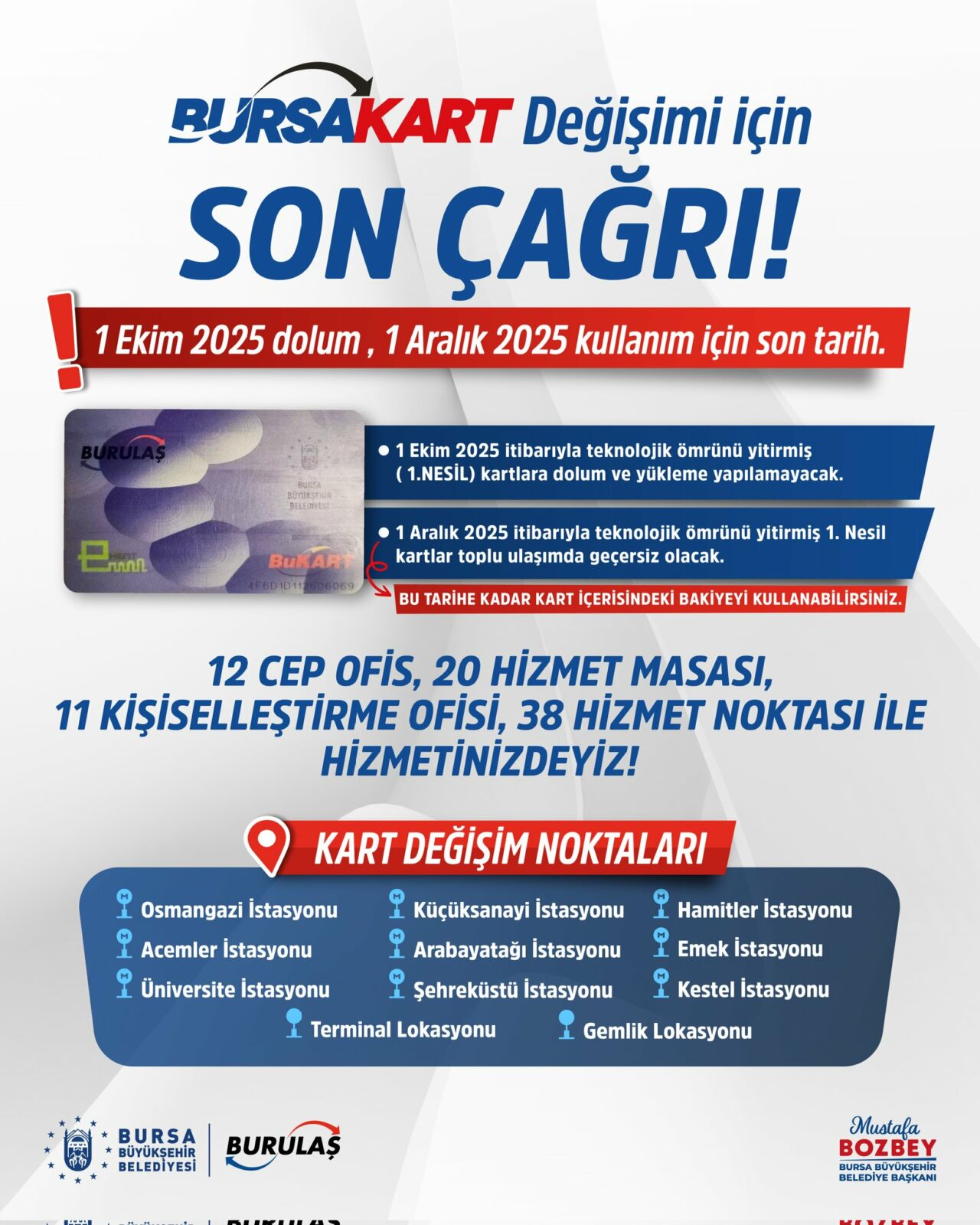 BURULAŞ, toplu ulaşımda kullanılan 1. nesil BursaKart’ların değişimi için “Son çağrı” notuyla vatandaşlara sosyal medya hesabından hatırlatma yaptı.