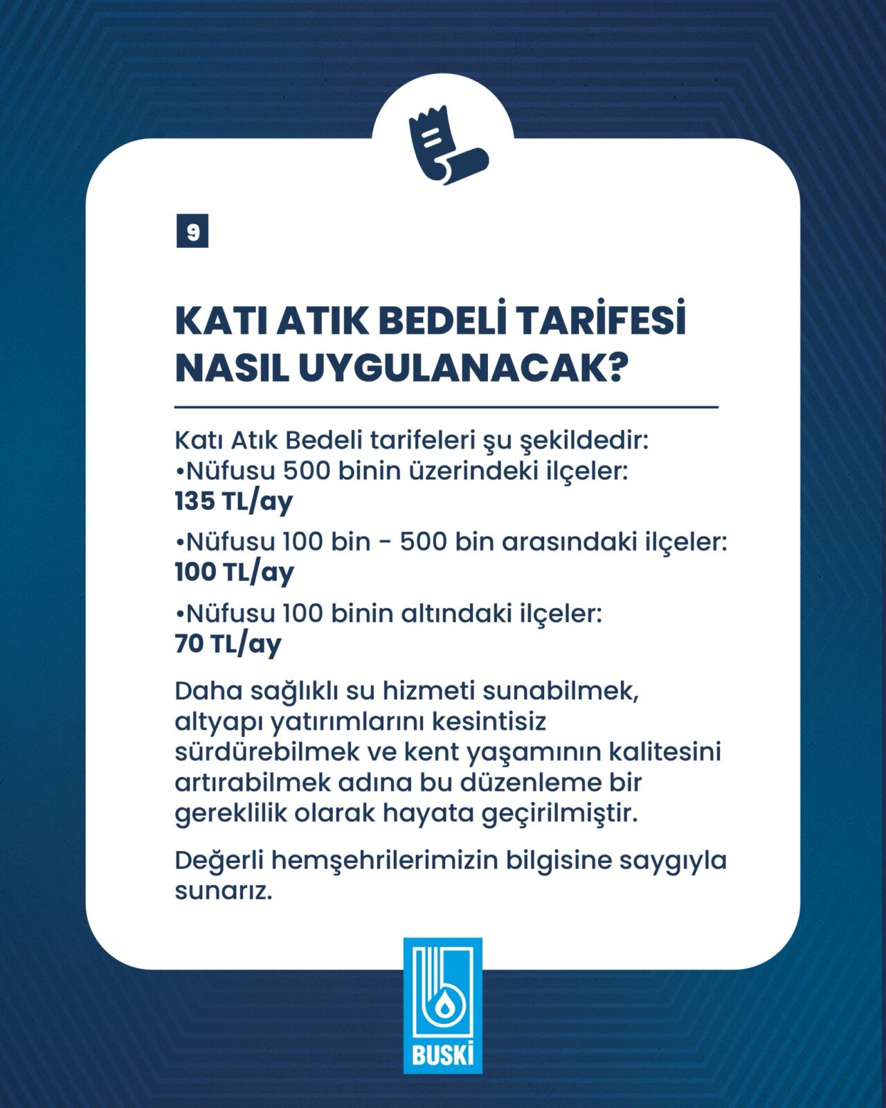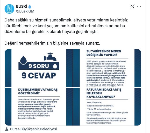 “Daha sağlıklı su hizmeti sunabilmek, altyapı yatırımlarını kesintisiz sürdürebilmek ve kent yaşamının kalitesini artırabilmek adına bu düzenleme bir gereklilik olarak hayata geçirilmiştir. Değerli hemşehrilerimizin bilgisine saygıyla sunarız.” notuyla yapılan paylaşımda “9 soruda 9 cevap” başlığıyla konuya ilişkin şu bilgiler aktarıldı: