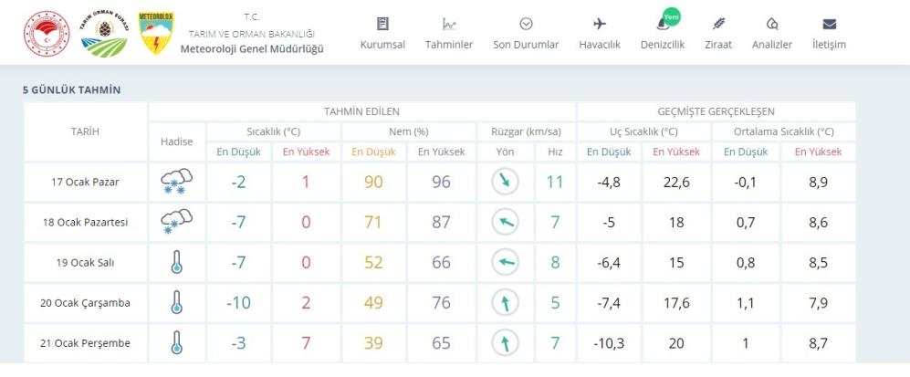 5 günlük hava tahmin raporuna göre pazartesi ve salı günü en düşük sıcaklığın sıfırın altında 7 derece olması, çarşamba günü sıfırın altında 10 dereceye kadar düşmesi bekleniyor.
