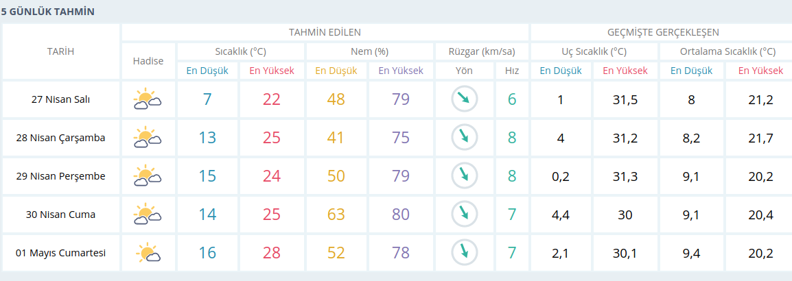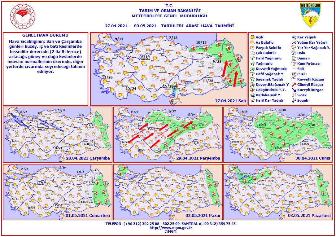 Haftalık Hava Durumu (27 Nisan – 3 Mayıs 2021) Hava sıcaklıklarının; Salı ve Çarşamba günleri kuzey, iç ve batı kesimlerde hissedilir derecede (2 ila 8 derece) artacağı, güney ve doğu kesimlerde mevsim normallerinin üzerinde diğer yerlerde civarında seyredeceği tahmin ediliyor.