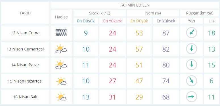 Salı günü ise en düşük 10, en yüksek 31 derece.