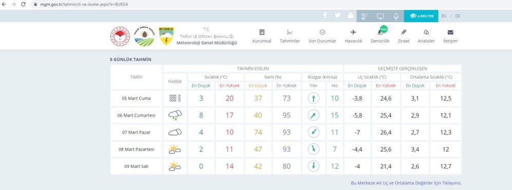 Meteoroloji Genel Müdürlüğünden alınan verilere göre, bugün Bursa az bulutlu, sıcaklık en yüksek 20, en düşük 3 derece olacak. Cumartesi için yağmur beklenen Bursa’da pazar gününün ise çok bulutlu olarak geçeceği tahmin ediliyor.