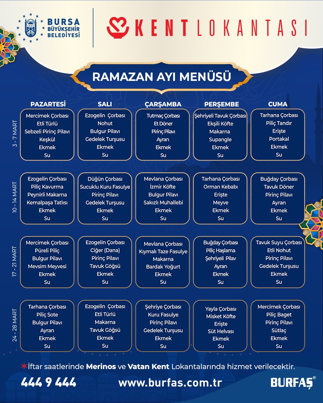 BURFAŞ’ın sosyal medya hesabından yapılan açıklamada, Bursalılar lezzetli ve ekonomik menülerle iftar sofralarına davet edilirken, ramazan ayı menülerinin de hazırlandığı belirtildi.