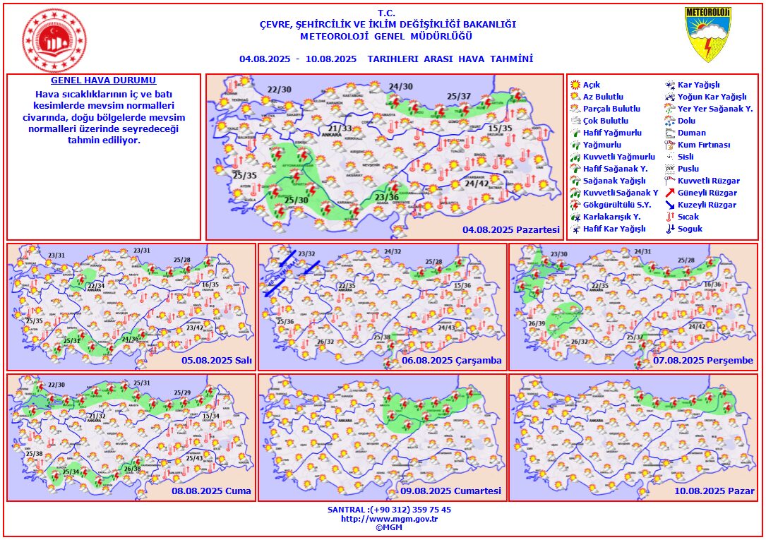 Genel olarak hafta boyunca sıcaklıklar 33 ile 35 derece arasında değişecek.