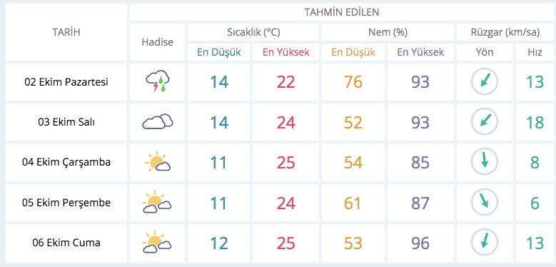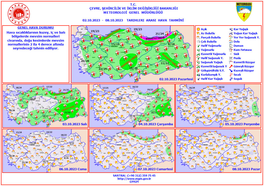 Meteoroloji Genel Müdürlüğü tarafından yapılan son değerlendirmelere göre: Ülkemiz genelinin parçalı ve çok bulutlu, Marmara’nın batısı ile Kıyı Ege dışında kalan yerlerin aralıklı sağanak ve gök gürültülü sağanak yağışlı geçeceği tahmin ediliyor. Marmara’nın doğusu, Batı Karadeniz kıyıları, Orta ve Doğu Karadeniz, İç Anadolu’nun güneydoğusu, Güneydoğu Anadolu’nun doğusu ve Doğu Anadolu’nun güneybatısında beklenen yağışların yer yer kuvvetli, Orta ve Doğu Karadeniz kıyılarında ise çok kuvvetli olacağı tahmin ediliyor.