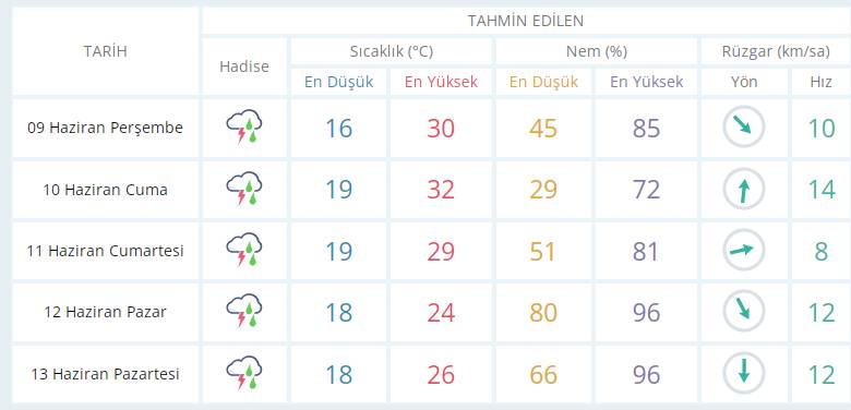 “Özellikle yurdun kuzey ve iç kesimlerinde sağanak ve gök gürültülü sağanak şeklinde yağışlar olacak. Ancak cuma günü gece saatlerinden itibaren yurdun kuzeybatısında yeni bir yağış ve serin havanın etkisi altına girmeyi bekliyoruz. Bu yeni havayla yurdun kuzey ve iç kesimlerine ek olarak pazartesi gününden itibaren Güneydoğu Anadolu ve Doğu Anadolu’nun güneyi hariç her yer yağış alacak. Yağışlar yine sağanak ve gök gürültülü sağanak şeklinde olacak bu hafta boyunca. Ancak bugün yeni hava, sıcaklıkta da bir miktar düşme yaratacak diye tahmin ediyoruz. Cumartesi günü yurdun batısı, pazar günü orta kesimler ve pazartesi günü de doğu kesimlerde sıcaklar hissedilir derecede azalacak.”