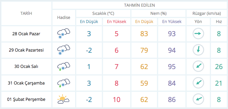 Meteoroloji Genel Müdürlüğü olarak yapılan son değerlendirmelere göre: yurdun genelinin parçalı ve çok bulutlu, Marmara, İç Ege, Batı Akdeniz, İç Anadolu, Karadeniz, Doğu Anadolu güney doğusu ile Erzurum, Kars, Ardahan, Batman, Mardin ve Siirt çevrelerinin yağışlı geçeceği tahmin ediliyor. Kıyı kesimlerde karla karışık yağmur, iç kesimlerde kar şeklinde, güney kıyı kesimlerde yağmur ve sağanak şeklinde olması beklenen yağışların Bolu çevreleri ile Zonguldak, Bartın, Karabük ve Düzce illerinin yüksek kesimleri, Kastamonu’nun kuzeyinin yüksekleri, Sakarya’nın güney ve doğusunun yükseklerinde kuvvetli kar yağışlar olması bekleniyor.