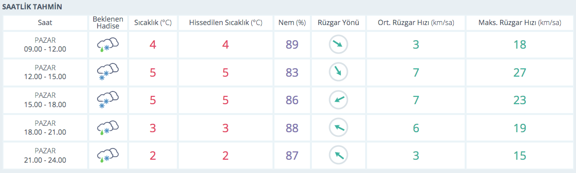 Çok bulutlu, Ardahan, Kars, Erzurum, Van, Bitlis, Şırnak ve Hakkari çevrelerinin aralıklı karla karışık yağmur ve kar yağışlı geçeceği tahmin ediliyor. Bölge genelinde buzlanma ve don olayı ile birlikte gece ve sabah saatlerinde pus ve yer yer sis bekleniyor.