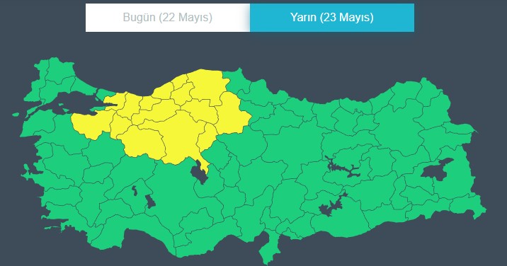 Sarı kodlu uyarı yapılan iller: Ankara, Bilecik, Bolu, Bursa, Çankırı, Çorum, Eskişehir, Kastamonu, Kocaeli, Sakarya, Zonguldak, Kırıkkale, Bartın, Karabük ve Düzce.