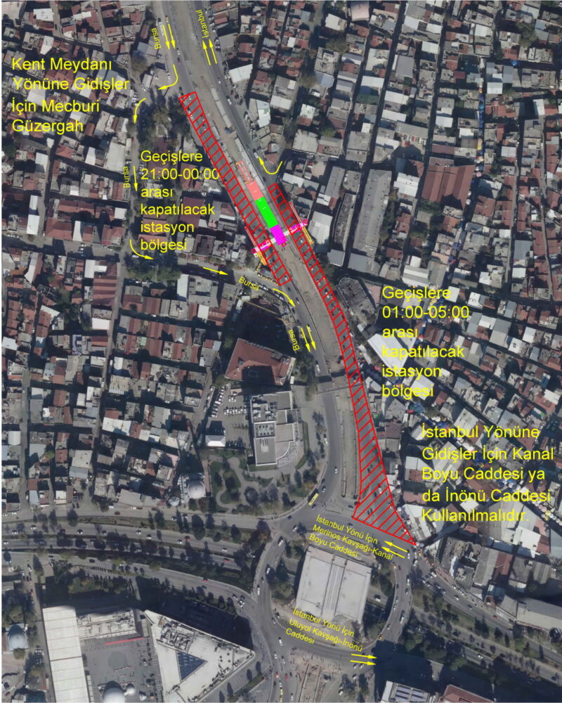 Bursa Büyükşehir Belediyesi’nce yaptırılan Kent Meydanı-Terminal Tramvay Hattı İnşaatı Tamamlama İşleri kapsamında, İstanbul Caddesi üzerinde bulunan Gençosman’daki raylı sistem istasyon üst geçidinin çelik montaj imalatları yapılacaktır. 09 Nisan 2021 Cuma (BUGÜN) saat 21:00 ile 05:00 saatleri arasında İstanbul Caddesi üzerinde bulunan Kent Meydanı-Gençosman raylı sistem üstgeçit arasında trafik çift yönlü kapatılacak olup, trafik alternatif güzergâhlardan sağlanacaktır.