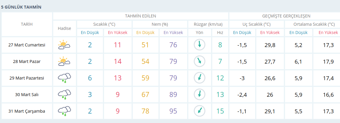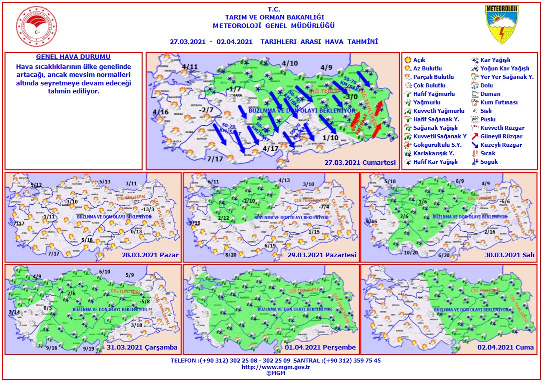 Haftalık Hava Durumu (27 Mart – 2 Nisan 2021) Hava sıcaklıklarının ülke genelinde artacağı, ancak mevsim normalleri altında seyretmeye devam edeceği tahmin ediliyor.