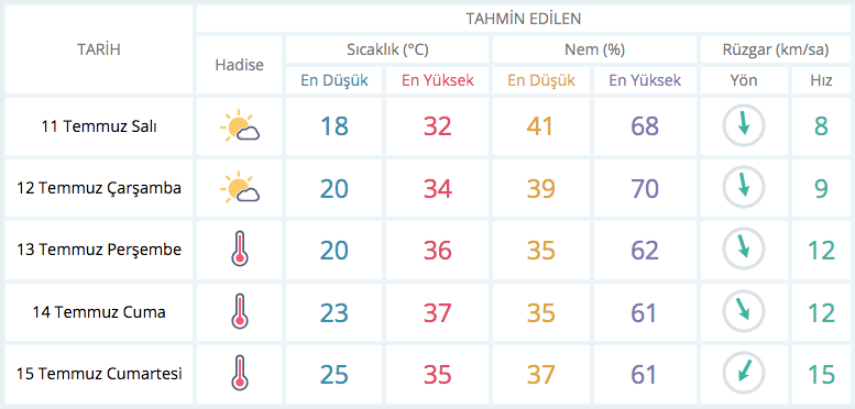 Bursa 32-37, Ankara 31-35, İstanbul 32-36, İzmir 36-40, Edirne 37-41, Çanakkale 36-39, Muğla 36-40, Adana 38-42, Antalya 37-43, Kayseri 30-32.
