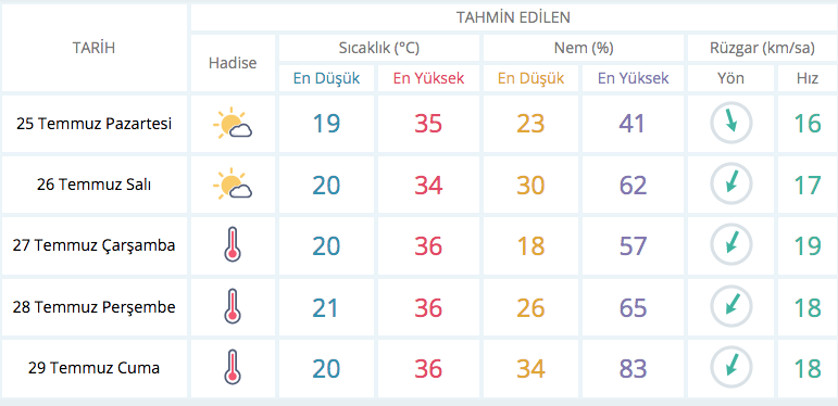 Günün en yüksek sıcaklıklarının Ankara’da 30-35, İstanbul’da 30-32, İzmir’de 27-39, Antalya’da 39-40, Adana’da 36-37, Diyarbakır’da 37-42, Samsun’da 26-27 derece civarında olacağı tahmin ediliyor. (TRT Haber)