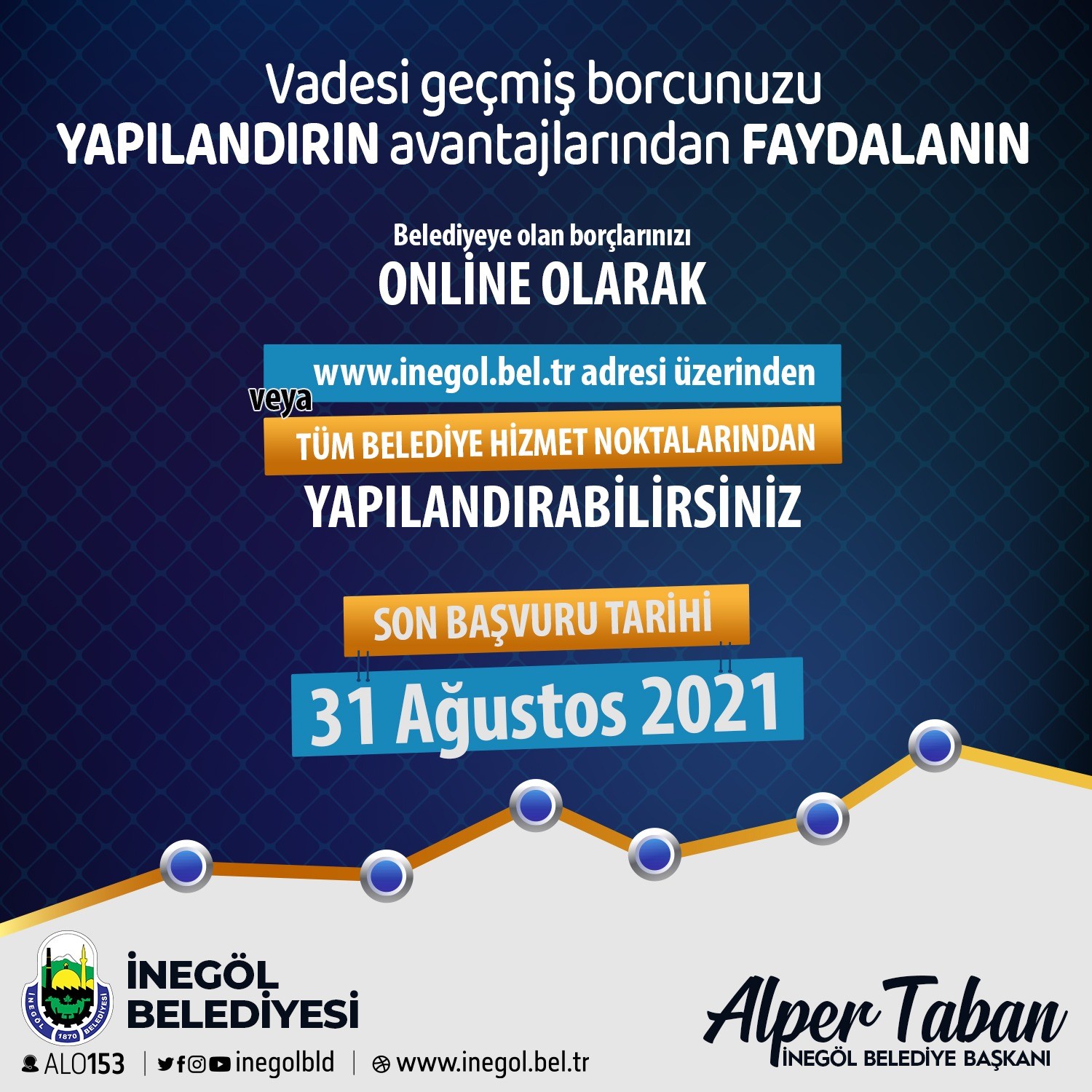 31 Ağustos 2021 tarihinde sona erecek başvurulara ilişkin İnegöl Belediyesinden yapılan açıklamada; vatandaşların işlemlerini kolaylaştıracak adımlar atılarak bu kapsamda yapılandırma başvurularının belediyeye ait https://ebelediye.inegol.bel.tr/Giris/Index/?returnURL=/Tecil/Basvuru/ adresinden ve e-devlet üzerinden https://www.turkiye.gov.tr/inegol-belediyesi-borc-yapilandirma-basvurusu adresinden online olarak yapılabileceği, ayrıca Belediyenin tüm hizmet binalarında da yapılandırmaya ilişkin başvuruların yapılabileceği ifade edildi.
