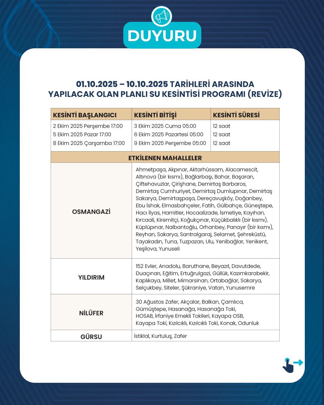 “BUSKİ Genel Müdürlüğümüz tarafından, yaşanan küresel ısınmaya bağlı iklim değişikliği neticesinde ortaya çıkan kuraklık sonucu su kaynaklarının azalması ve baraj doluluk oranlarının kritik seviyeye düşmesi sebebiyle, planlı su kesintisi yapılması mecburiyeti/ihtiyacı doğmuştur. Söz konusu planlı su kesintileri, günlük 12 saati geçmemek kaydıyla, merkez ilçelere bağlı mahallelerde dönüşümlü olarak uygulanacaktır. Yapılması planlanan su kesintileri ile günlük 100 bin metreküp su tasarrufu yapılması hedeflenmektedir. Planlı su kesintilerinden, Uludağ Üniversitesi, Şehir Hastanesi ve Devlet Hastaneleri etkilenmeyecektir. Planlı su kesinti listesi ekte sunulmuştur”