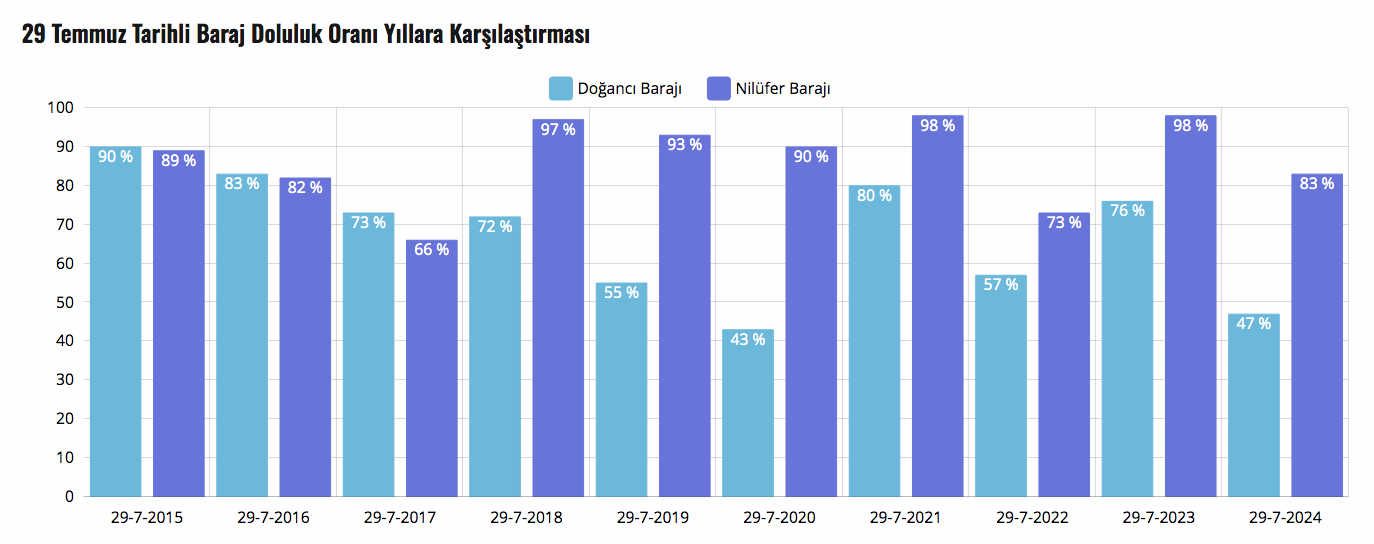 BUSKİ Genel Müdürlüğü’nün internet sitesinden alınan bilgilere göre; Doğancı Barajı’ndaki doluluk yüzde 47, Nilüfer Barajı’ndaki doluluk ise yüzde 83 olarak ölçüldü.