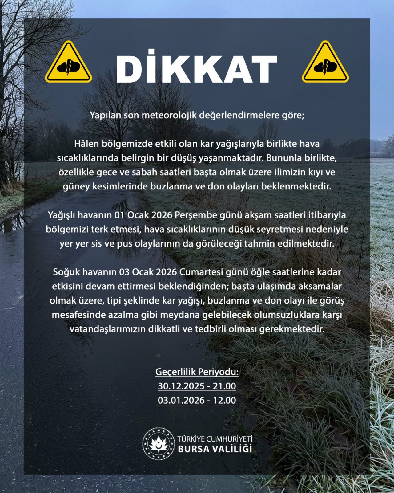 Ana Sayfa › Bursa › Merkez › Bursalılar dikkat! Valilik’ten çok önemli uyarıBursalılar dikkat! Valilik’ten çok önemli uyarı Bursa Valiliği, kentte etkili olan soğuk hava nedeniyle buzlanma ve don olayı uyarısında bulundu. Giriş: 30-12-2025 19:22Güncelleme: 30-12-2025 22:55Kaynak: HABER MERKEZİ MerkezBursa ABONE OL + - HABERİ PAYLAŞ