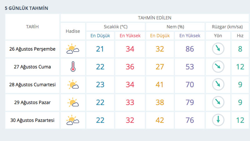 Günün en yüksek hava sıcaklığının, İstanbul’da 31-33, Ankara’da 34-37, İzmir’de 34-35, Samsun’da 29-31, Rize’de 28-31, Konya’da 34-36, Kayseri’de 36-39, Kahramanmaraş’ta 38-41, Erzurum’da 29-33, Elazığ’da 37-41, Diyarbakır’da 39-42, Gaziantep’te 36-40 derece civarında seyretmesi öngörülüyor.