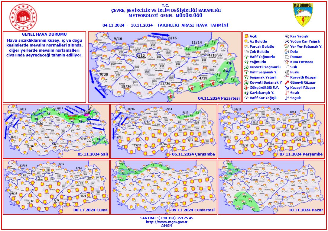 “Yapılan son meteorolojik değerlendirmelere göre; 04 Kasım 2024 Pazartesi gününden itibaren hava sıcaklıklarının hissedilir derecede (4 ila 6 derece) azalacağı ve mevsim normallerinin altına ineceği tahmin edilmektedir.