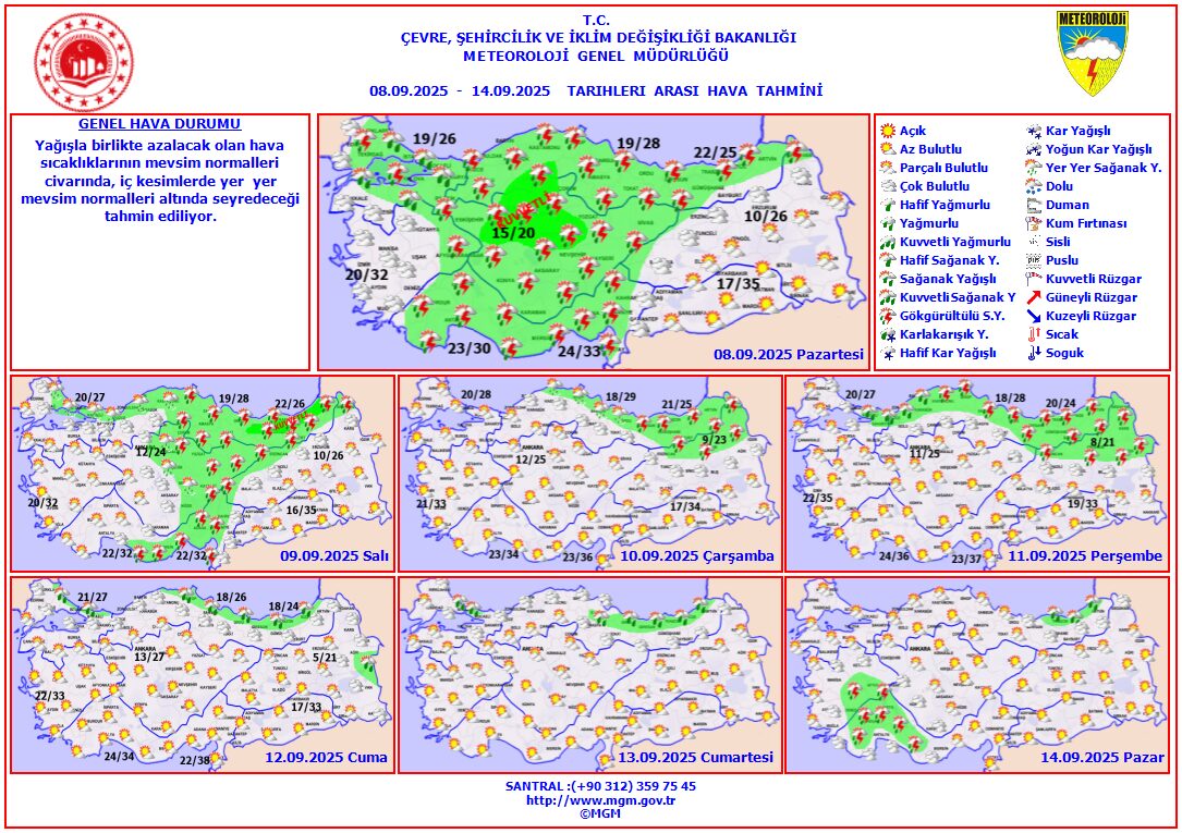 8 Eylül Pazartesi: Sağanak Yağışlı 17°C / 26°C