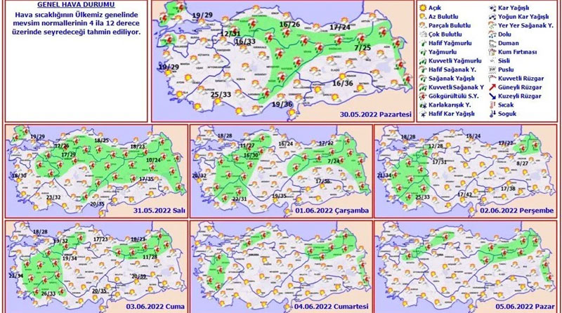 🌡Hava Sıcaklığı: Kuzeydoğu kesimlerde artmaya devam edeceği, Kıyı Ege'de biraz azalacağı, diğer yerlerde önemli bir değişiklik olmayacağı, Ülkemiz genelinde mevsim normallerinin 4 ila 12 derece üzerinde seyredeceği tahmin ediliyor. pic.twitter.com/VTEyDIpQNI— Meteoroloji (MGM) (@meteoroloji_twi) May 30, 2022