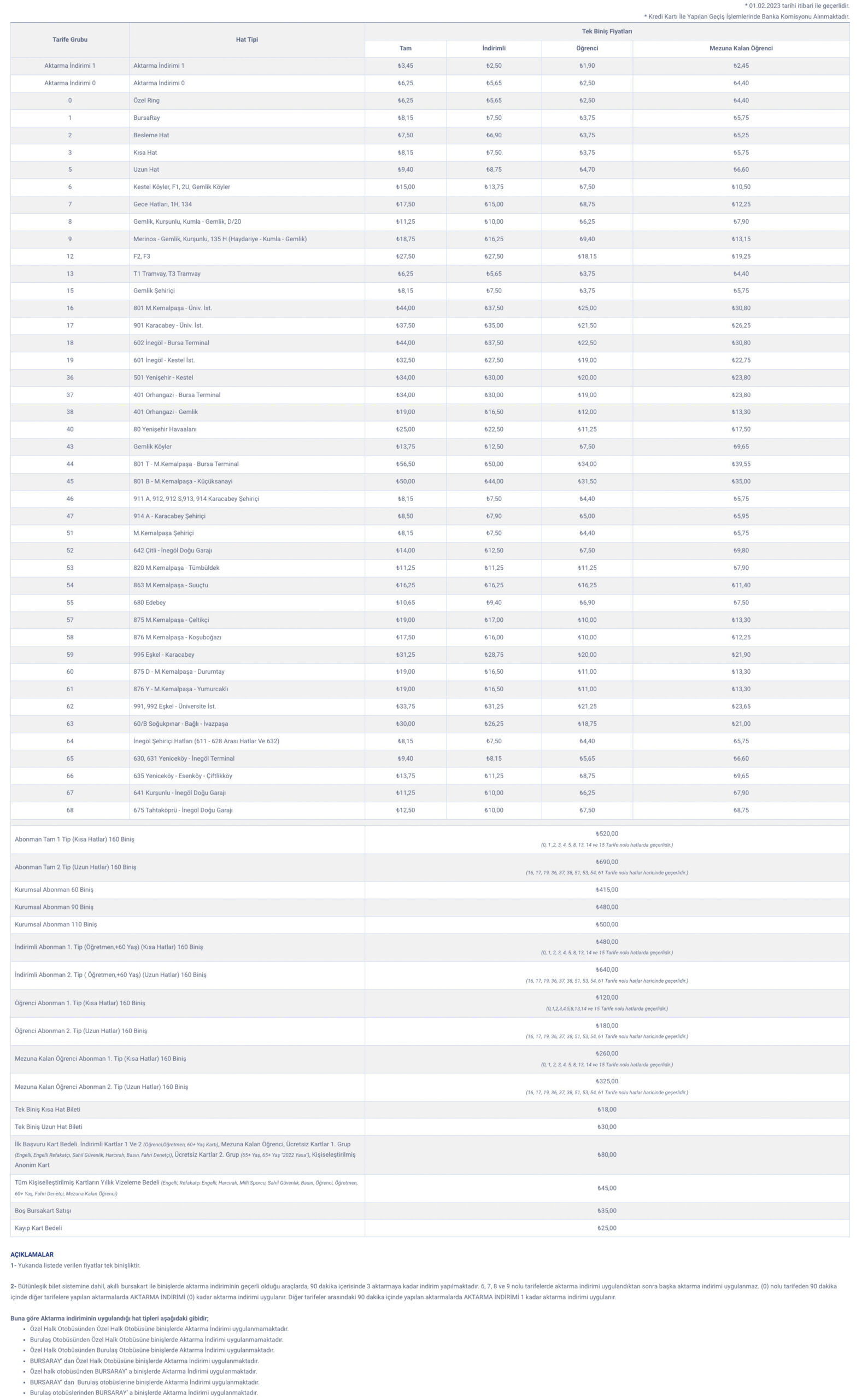 Büyükşehir Belediyesi’ne bağlı BURULAŞ’ın resmi internet sitesinde yer alan yeni fiyatlara göre, Bursaray başta olmak üzere toplu ulaşım araçlarına bugünden itibaren geçerli olmak kaydıyla yüzde 25 zam yaptı…