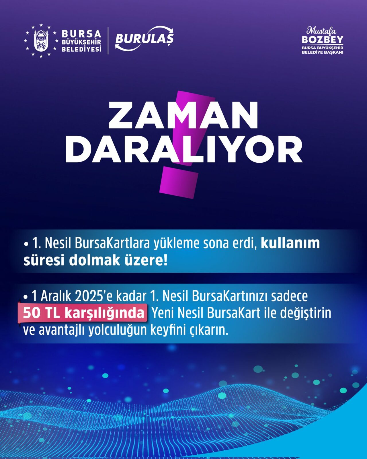 BURULAŞ’ın sosyal medya hesabından yapılan açıklamada; eski nesil kartların teknolojik ömrünü tamamladığı ve belirtilen tarihten sonra toplu ulaşım araçlarında kullanılamayacağı ifade edildi.