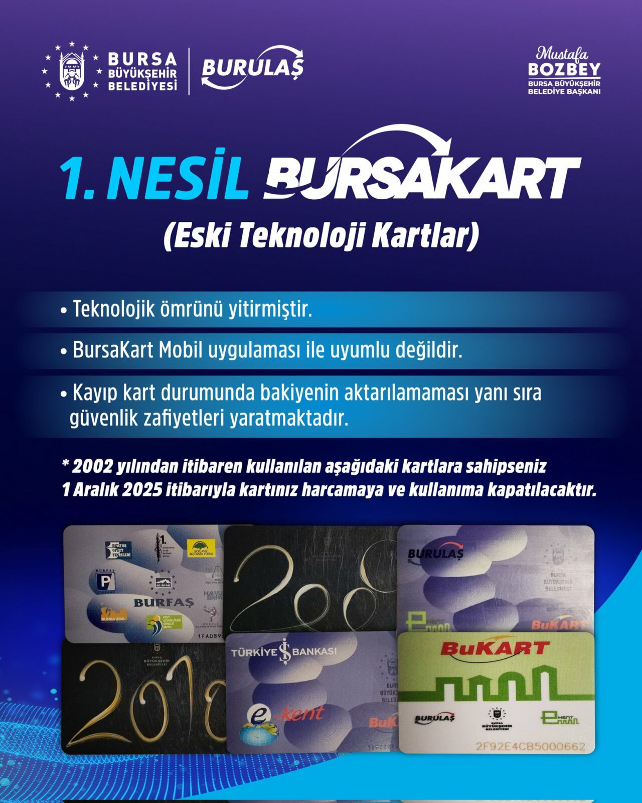 Bursa Büyükşehir Belediyesi’nin ulaşım iştiraki BURULAŞ, toplu taşıma sistemlerinde kullanılan 1. nesil BursaKartların 1 Aralık 2025 itibarıyla geçerliliğini yitireceğini duyurdu.