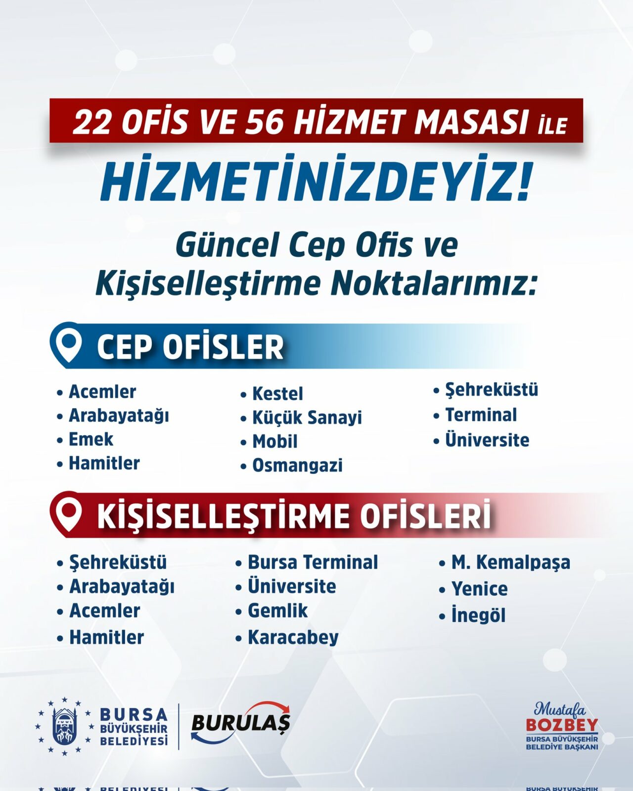 BURULAŞ; kart değişim işlemlerinin Osmangazi, Acemler, Üniversite, Arabayatağı, Hamitler, Terminal, Küçük Sanayi, Emek, Şehreküstü ve Kestel istasyonları ile mobil araç üzerinden yapılabileceğini bildirdi.