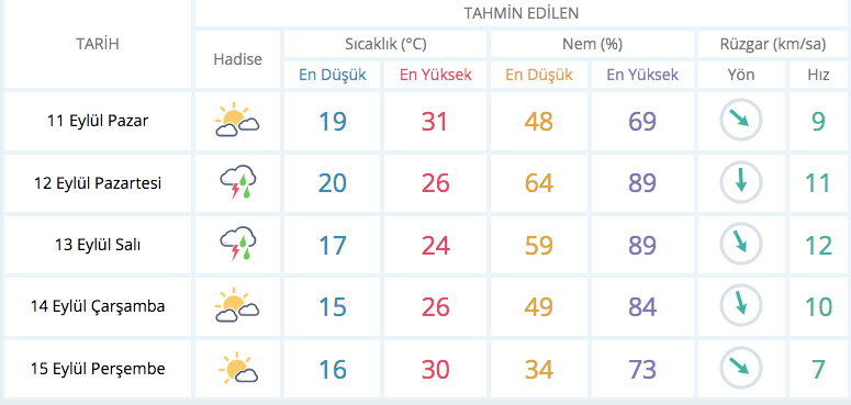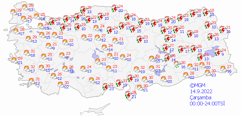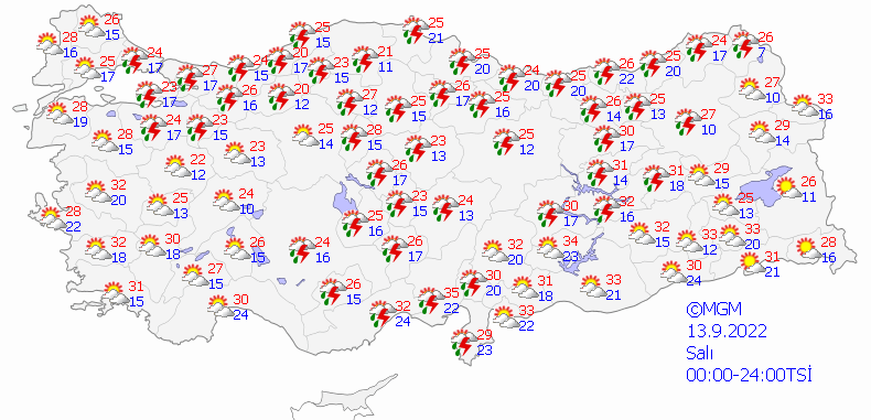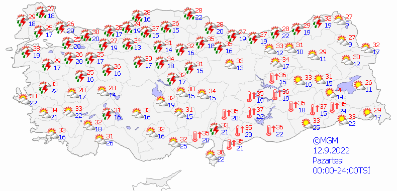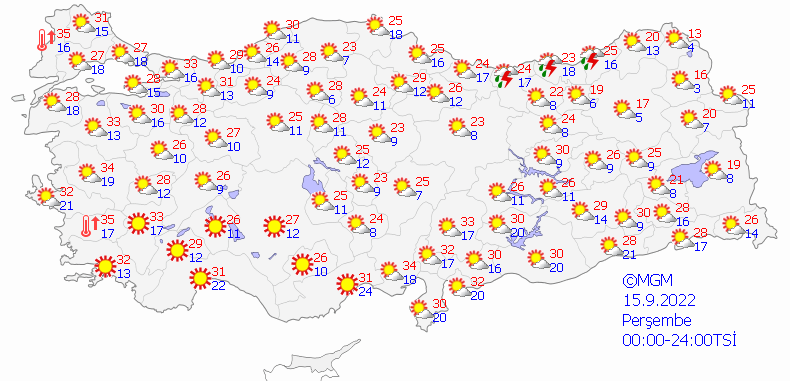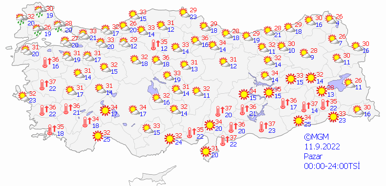 İstanbul 30, Ankara 32, İzmir 35, Bursa 32, Antalya 33 derece.